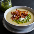 This velvety roasted cauliflower soup has a beautiful flavor without needing any dairy and is topped with crispy bacon and bright pesto.