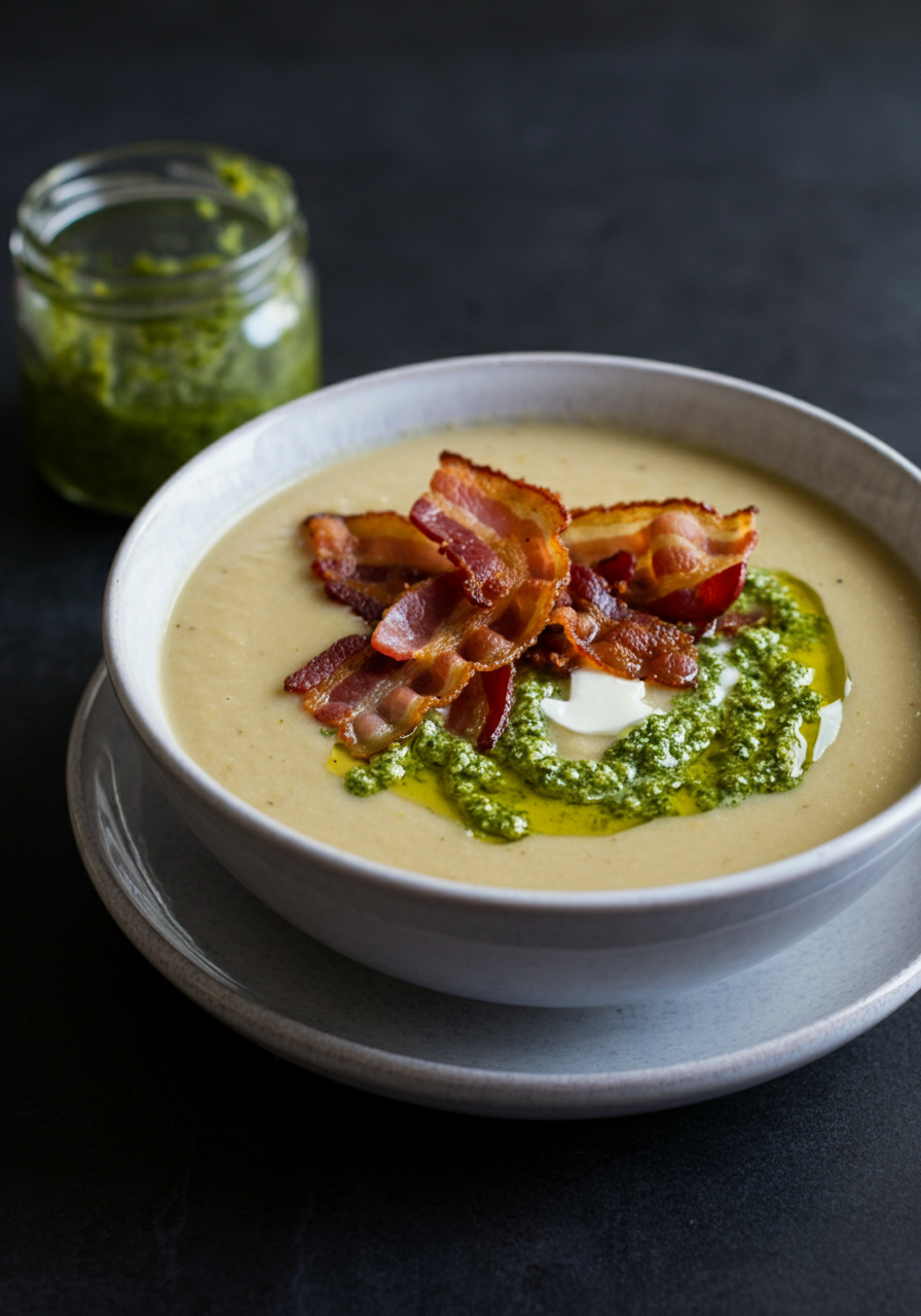 Creamy, dreamy cauliflower soup gets a smoky bacon boost and vibrant pesto swirl. Perfect for a cozy night in!