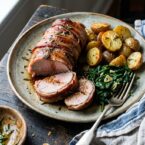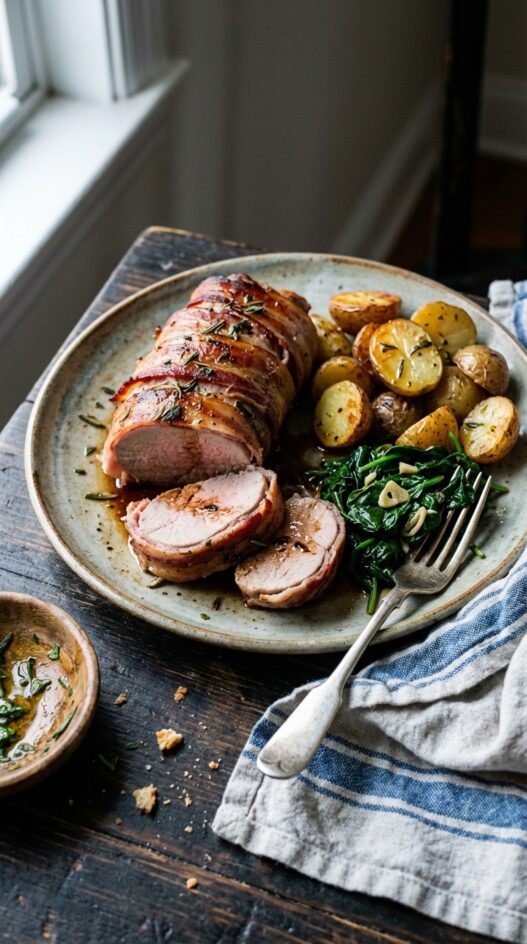 I’ve decided that this year the centerpiece for my holiday dinner will be this flavorful, juicy and elegant pork roast. Coated with herbs, wrapped in scrumptiously crispy bacon, and served with garlicky sautéed spinach and rosemary infused, mini medley potatoes. These potatoes are so colorful that add a festive touch to the whole plate.