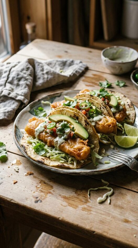 Baja-style fish tacos are the pride of the Ensenada coast — beer-battered white fish tucked into corn tortillas with crunchy cabbage slaw and a tangy lime crema. The contrast of hot, crispy fish against cool, creamy sauce is what makes them impossible to eat just one of. This is the taco that launched a thousand taco trucks, and it is easier to make at home than you think.