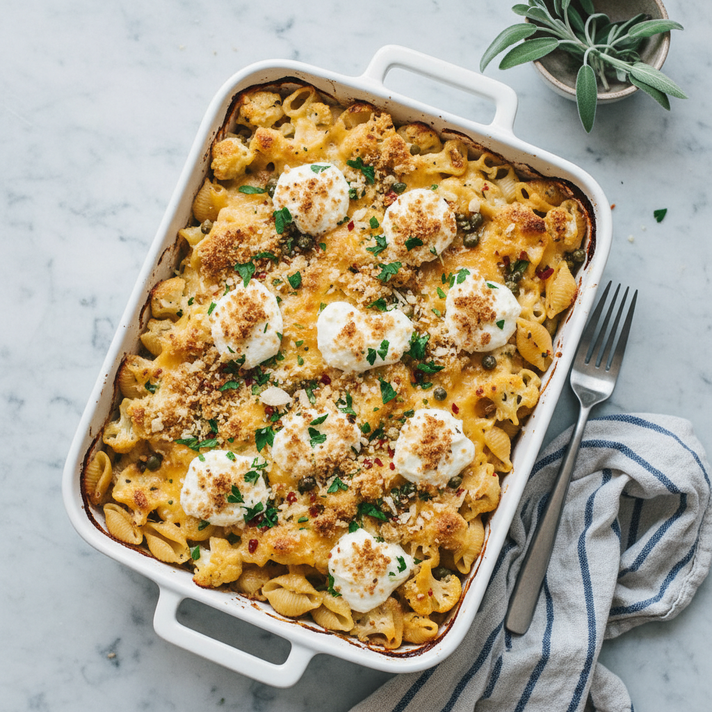 This baked crusted pasta shells and cauliflower dish combines salty capers, lemon zest, and fresh ricotta for a comforting vegetarian meal perfect for a cold night.