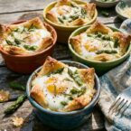 Flaky puff pastry cups filled with cheesy eggs and asparagus. A fun and elegant brunch dish.