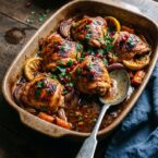 Sweet and spicy harissa paste glazes juicy chicken thighs, baked alongside tender carrots and onions. A vibrant, flavorful weeknight meal.