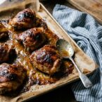The key, so it seems, is to use dijon mustard and a good quality honey. Mix the two in equal parts and you end up with a perfectly balanced sauce that is beautifully sweet and tangy. Simply brush it on the chicken thighs a couple of times while it bakes and you’re ready for dinner. Print