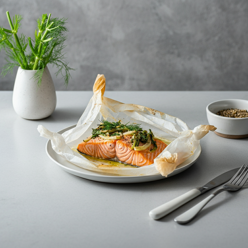 - Fold a baking paper in half to create a crease, then open it. Place fennel slices above the crease, sprinkle with salt, top with a salmon fillet, beans, and tomatoes. Squeeze lemon juice over all ingredients; season with salt and pepper. Lay lemon slices over the salmon.