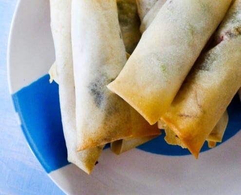 Feel free to experiment with your own fillings on top of this vegan suggestion. Capsicum, Asian mushrooms, carrot and zucchini are all great fillings. Make sure to pack the ingredients right in for a more nutritious and satisfying roll. For a non-vegan version you could mix in some shredded chicken or barbecue duck. Print