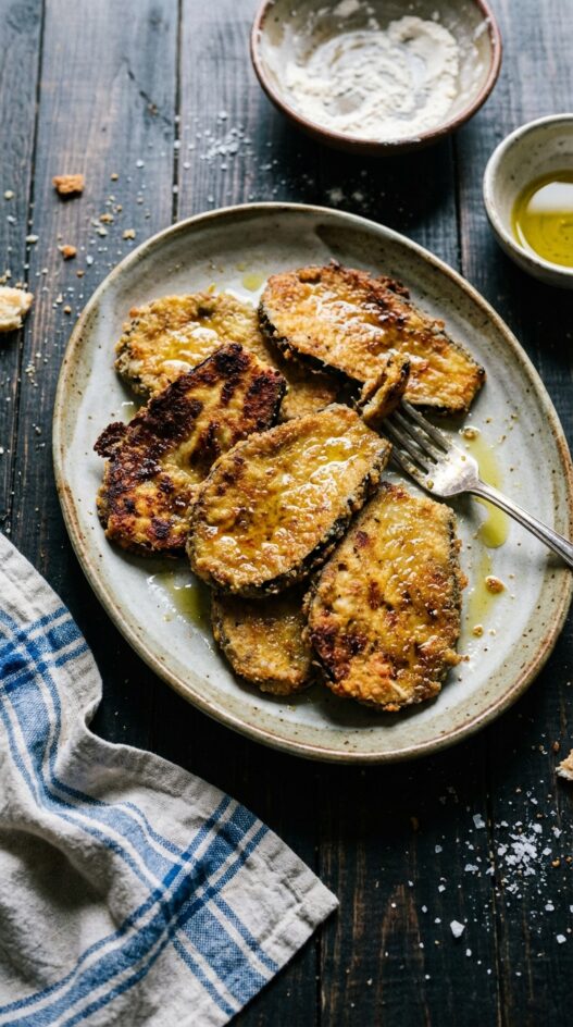 Slice the eggplant and consider salting it for about 30 minutes to draw out excess moisture and bitterness before breading and baking.