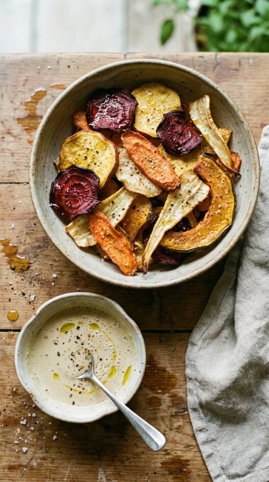 Crispy baked veggie chips are incredibly easy to make. Serve with a bright, tangy tahini dip for a perfect snack.