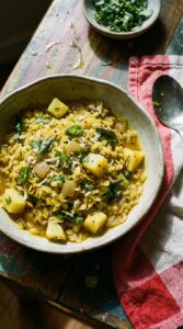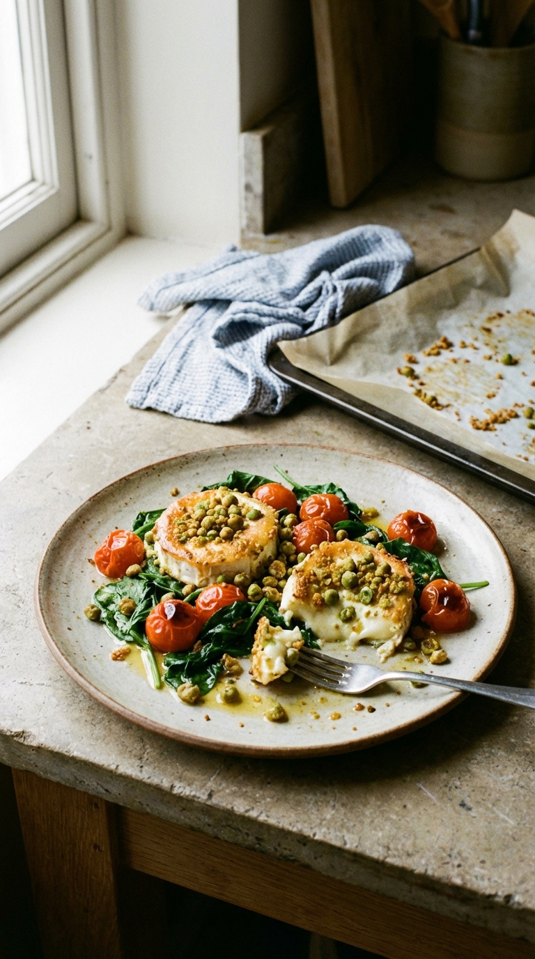 A friend brought this to a dinner party years ago and I spent the whole evening trying to figure out what the coating was. Wasabi peas: that was it. Crushed wasabi peas pressed onto rounds of cold goat cheese, frozen briefly to firm up, then baked until warm through and just starting to brown on the edges. Sharp and creamy at the same time, with a crunch that holds up to the heat. I have made it for almost every dinner party since. It works as an appetizer on its own or perched on a handful of dressed greens with some cherry tomatoes.