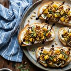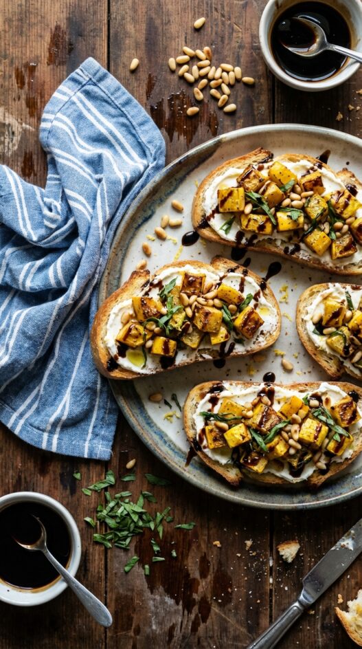 - Top the toasts with chèvre, a spoonful of squash, and a drizzle of balsamic reduction.