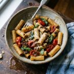 I loved this! I tweaked it a bit – sliced the garlic instead of chopped, added sliced sausages, and added some fresh basil into the sauce and not just on top. Once the vinegar reduced it just coated the pasta rather than a sauce, it was incredible! and SO simple!
