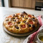 This focaccia is great served with soup, can be enjoyed throughout the day as a snack, and is wonderful cut into wedges and packed for a picnic. Here in Umbria I did not have a large round baking pan, so I just used my 12-inch springform pan so my focaccia is a little smaller and thicker than I had wanted but it still tasted great. I also used the tomatoes I had on hand, and I just happened to have a big bowl of cherry tomatoes that I had picked from the garden that morning that were very ripe, so I used those. Any fresh, ripe tomato will work just fine for this focaccia, and if tomatoes are not in season, you can even use a can of tomatoes drained to remove most of the liquid. Just break up the canned tomatoes with your fingers before adding on top of the focaccia.