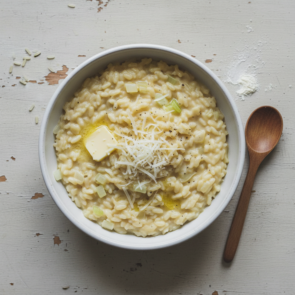 The rice should be tender but still have a slight bite in the center. The overall texture should be loose and creamy, flowing slowly when you tilt the pan, not stiff like porridge.