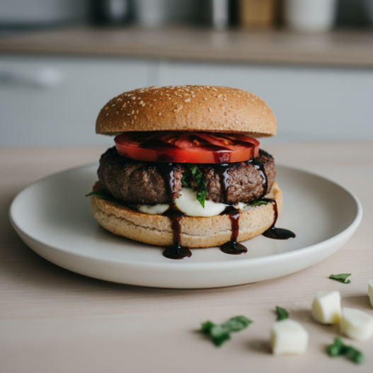 - Place the burger in the roll, top with glaze and a slice of tomato.