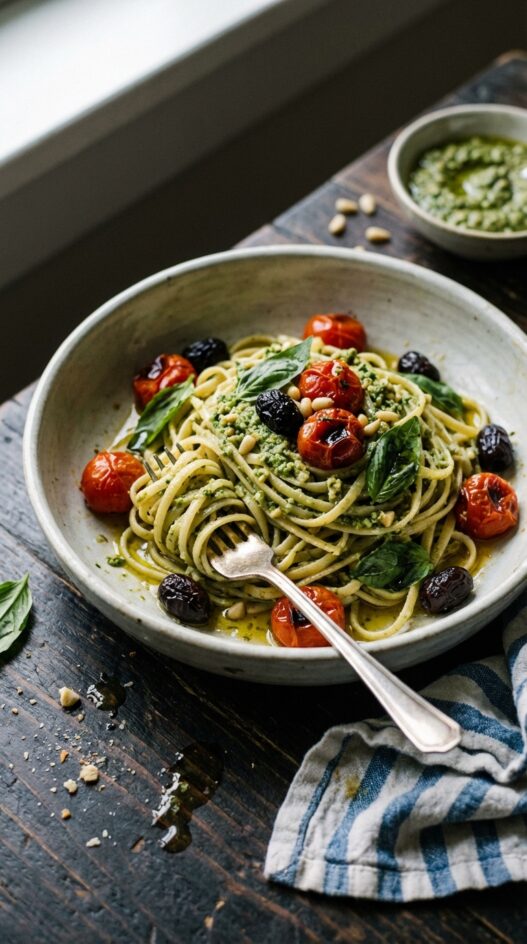 - Toss the linguine with basil pesto (use about 2 tablespoons) and serve with roasted tomatoes and olives, garnished with fresh basil.