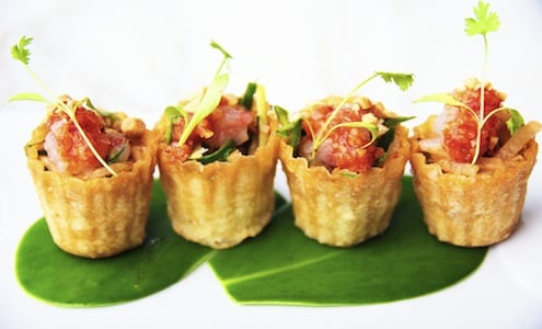 Often times, food and art can be the amazing connection between cultures. I became fascinated with the Art Deco of Miami and when I traveled to Singapore I saw that Art Deco was also a big part of the culture there. The SLS Hotel at South Beach is located in an astonishing historical art deco building so I wanted to honor that connection of Art Deco with Singapore in a bigger way. I traveled to Singapore and Asia to learn about the local foods and help us tell the story of The Bazaar. So that’s why you see dishes like the Traditional Sui Mai Pork, made with the freshest pork, shrimp, and peanuts and the Kueh Pai Ti, which is a very traditional street food in Singapore made using these very interesting cup molds. We saw this everywhere so we knew we had to make out own version. Ours is filled with shrimp, peanuts and chile sauce.