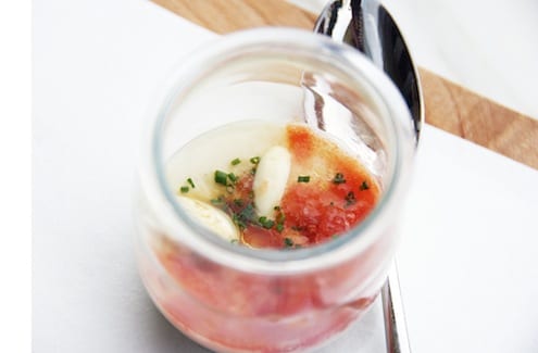 The most intriguing and provocative dish was the King Crab raspberries. Why? Because it was served in a can. Spain is well known for producing high quality canned goods and even though the dishes are made fresh daily, presenting them in a can is a tribute to Spain’s groundbreaking practice. The dish was so beautiful that I could not stop taking pictures. My dining companion, this time my daughter Issa, almost hit me over the head because she wanted to taste it. The combination of crab and raspberries may seem odd, but actually was a perfect pairing of flavors…and with pretty little flowers on top. Who can resist that?