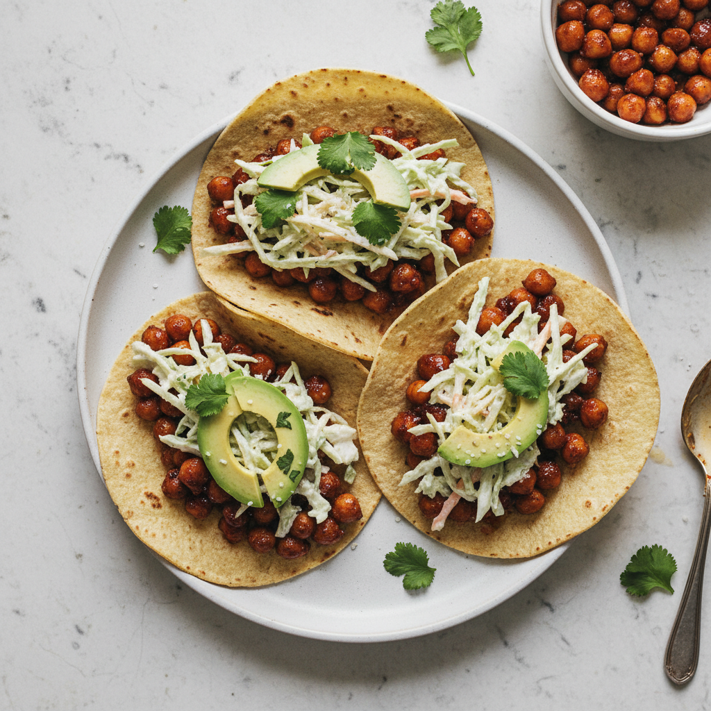 Crispy chickpeas tossed in smoky BBQ sauce are the star of these vibrant tacos. Topped with a creamy slaw and cool avocado, its a flavor explosion!