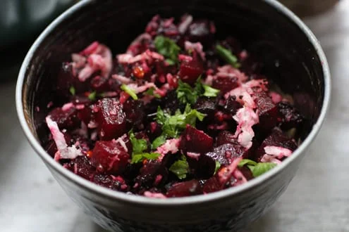 beets fried up with Indian spices, coconut, lemon and cilantro.