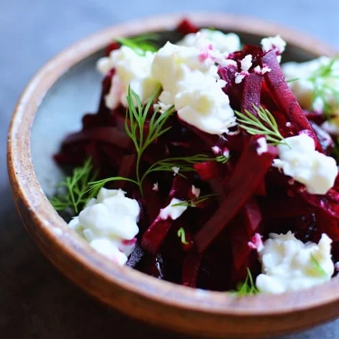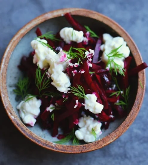 - Mix the cottage cheese with the horseradish, salt, pepper and garnish the beetroots with the cottage cheese and fresh dill.