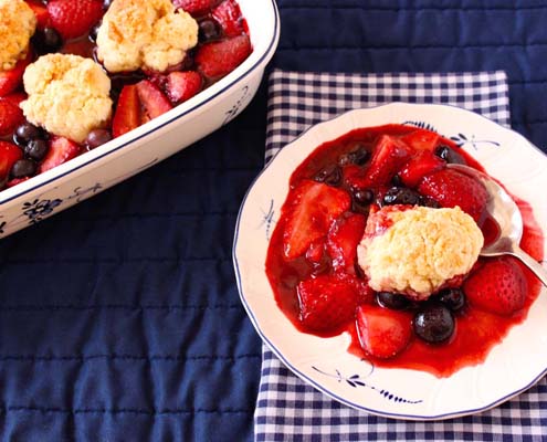 You’ll want to use the buttery biscuit topping to soak up every last drop of syrupy juice. I paired strawberries with blueberries; use any blend of berries you prefer, or try a mix of berries with slices of stone fruit. Print