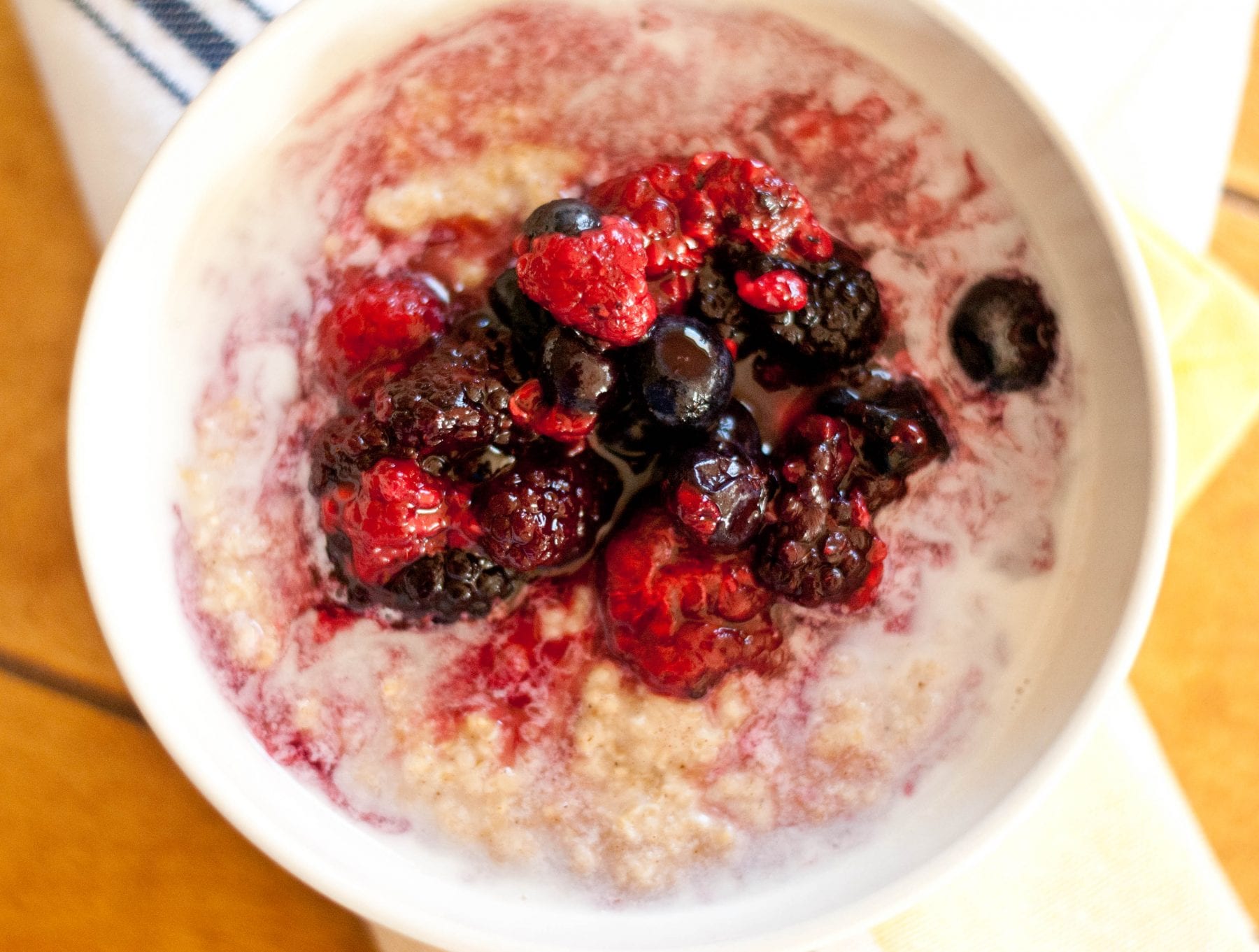 Feeling a bit chilly? Make this Berry Breakfast Porridge, stat. It’s exactly what you need on a cold winter’s morning, eaten in front of a roaring fire with a good cup of tea. It would also be a very appropriate, very lovely thing to make for your special someone for breakfast-in-bed on Valentine’s Day (because it’s red… and you know, there’s a law that everything has to be red on Valentine’s Day). Most of the ingredients are things you likely already have on hand, assuming you have a well stocked pantry. It comes together in under 10 minutes and is oh-so-good for you! I use quick cooking steel cut oats in my breakfast porridge because I prefer the texture over regular rolled oats – I think they lend really well to the slightly soupy, slurpable texture of a proper porridge. You’ll be able to find them at Whole Foods or Fairway, and maybe even Trader Joe’s (I buy Country Choice Organic brand).