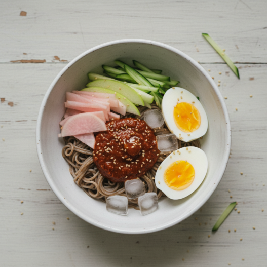 Traditional bibim naengmyeon uses thin buckwheat noodles, which have a firm, slightly chewy texture and a faint earthy flavor. They are typically sold dried or fresh at Korean grocery stores and need only a brief boil followed by a cold water rinse.