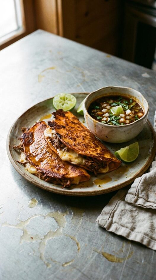 Remove the beef from the braising liquid and shred it with two forks. Skim the rendered fat from the surface of the consommé and reserve it – this is what you’ll use to fry the tortillas. The consommé should be rich, flavorful, and slightly thickened. If it’s too thin, simmer uncovered for a few minutes to reduce. If it’s too thick, add a bit of broth. Transfer the consommé to small serving bowls for dipping.