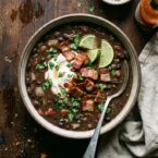 This soup is loaded with bright toppings like cilantro, cojita cheese, hot sauce, bacon, and more. Warm up a winter day with a hearty bowl of black bean soup.