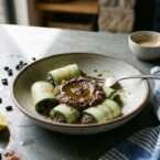 Use a mandoline or vegetable peeler to create thin, flexible ribbons about 1/16 inch thick. They need to be thin enough to roll around the filling without breaking.