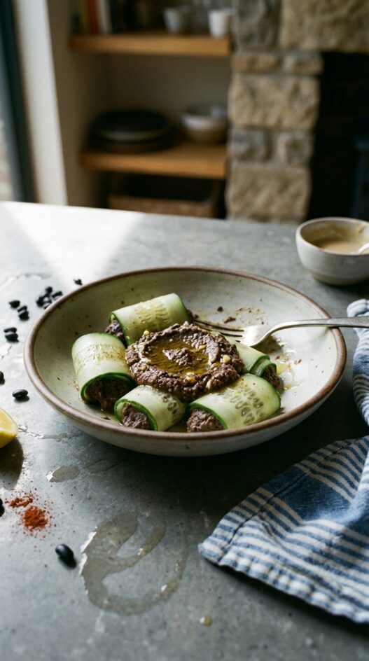 Crisp cucumbers rolled with a vibrant black bean hummus. A light, flavorful appetizer perfect for any occasion.