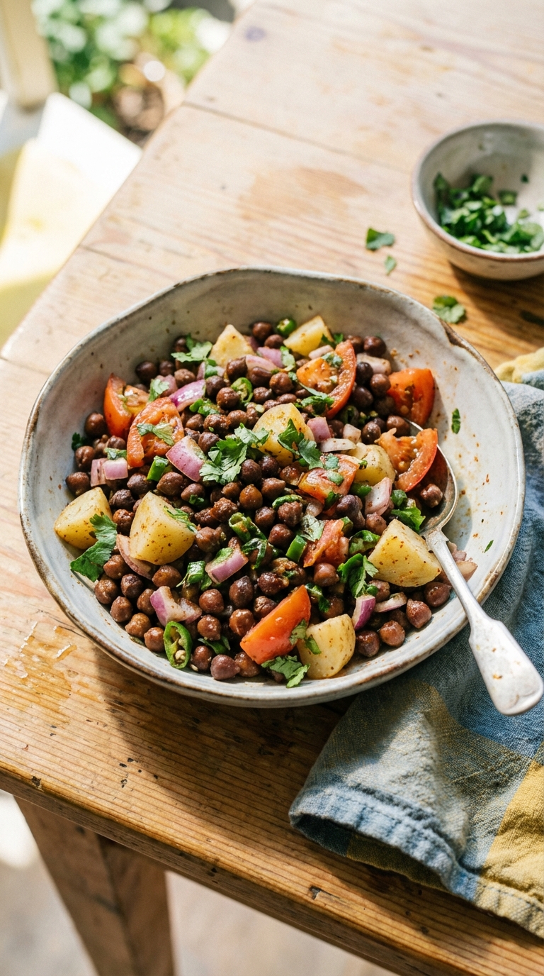 Have you cooked with black chickpeas? They are smaller and darker than regular chickpeas, with a firmer texture that holds up in a salad. This one boils them until tender, about forty minutes, then tosses them with chopped onion, tomato, green chilli, boiled potato, coriander, and a dressing of lemon juice, red chilli powder, garam masala, and amchoor powder.