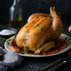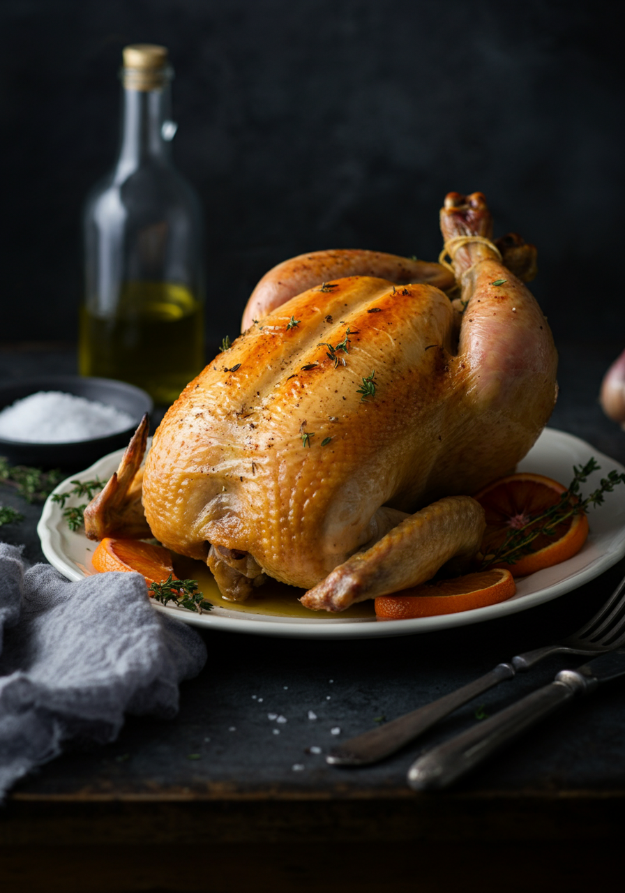 A juicy roast chicken, brined in blood orange and thyme, with a bright pan sauce. Perfect for a special dinner!