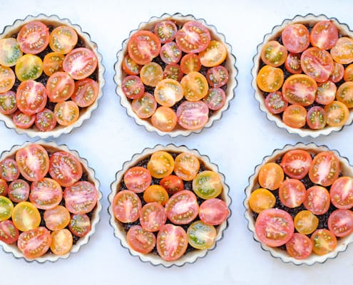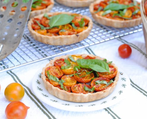 - Let tartlets cool until pans can be handled then remove tartlets from the pans and let cool completely on a wire rack. Stack about six large basil leaves on top of one another, roll up long ways, and chop into 1/4-inch strips. Sprinkle confettied basil over the tartlets and and top each with one whole basil leaf (or more, if you’re so inclined).