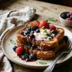 Sweet French toast soaked in a creamy custard, topped with homemade blueberry syrup and a tangy Devonshire cream. Perfect for a weekend brunch!