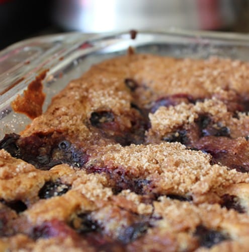 An extra-moist coffee cake packed with fresh blueberries and topped with a crunchy cinnamon sugar crumble.