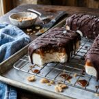 - Process the chilled ice cream base according to your ice cream maker’s instructions (15-20 minutes minimum churn time recommended). Spread ice cream into a sheet pan or cake pan lined with plastic wrap, press chopped peanuts into the top, spread caramel over top, and freeze until set. Alternatively, skip the ice cream machine and pour into a lined sheet pan or cake pan for a popsicle texture. Once slightly set, press peanuts into the top and spread with caramel.