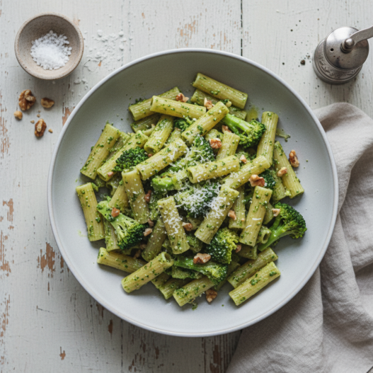 A quick weeknight pasta dish bursting with fresh broccoli and nutty pesto. Perfect for a simple yet satisfying meal.