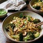 - Add the cooked and drained lo mein noodles to the skillet with the broccoli.