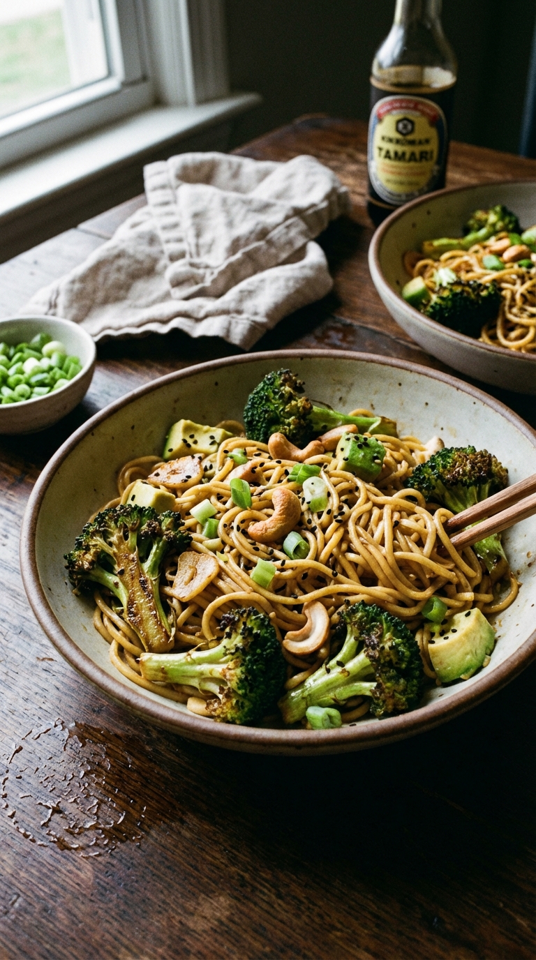 Hearty noodles tossed with garlicky broccoli and a sesame-soy dressing. Topped with creamy avocado and crunchy cashews.