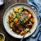 - Pour the balsamic butter sauce evenly over the salmon and vegetables.