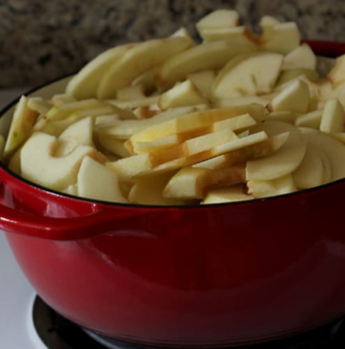 - Peel, core, and slice the apples into 1/4″ slices. No need to be exact here, but know that the smaller you cut them, the more quickly they will cook.
