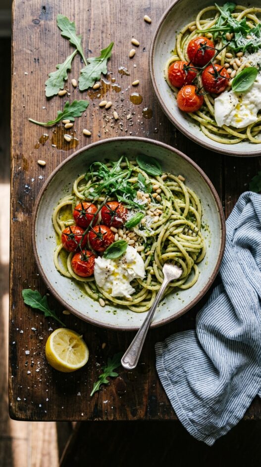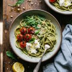 Creamy burrata, blistered tomatoes, and a vibrant arugula pesto coat bucatini pasta in this light yet satisfying dish. Perfect for a weeknight dinner!