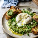 - Pour over more pea pesto, a drizzle of extra virgin olive oil, salt, and pepper.