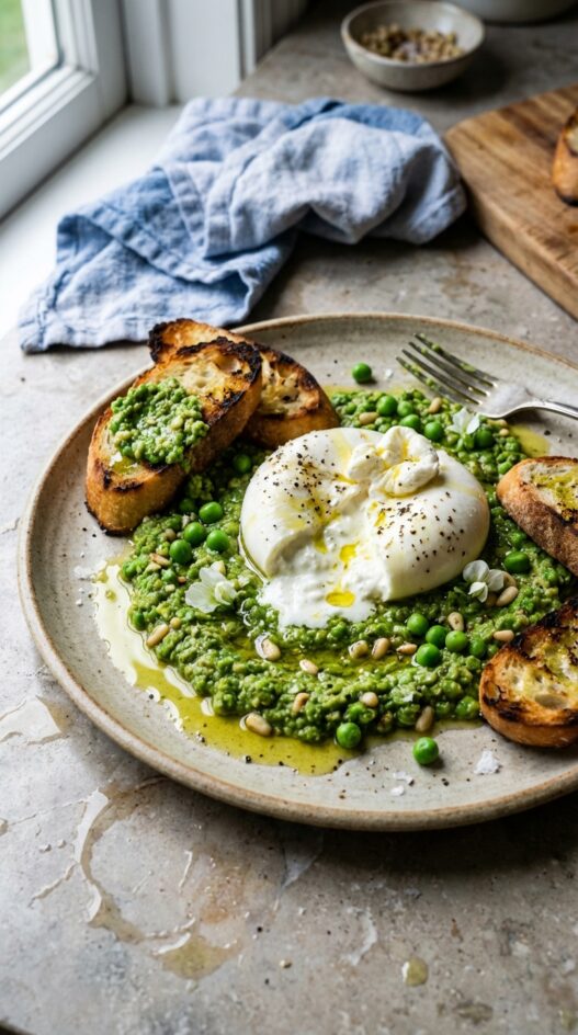 Burrata with Minty Pea Pesto Bruschetta