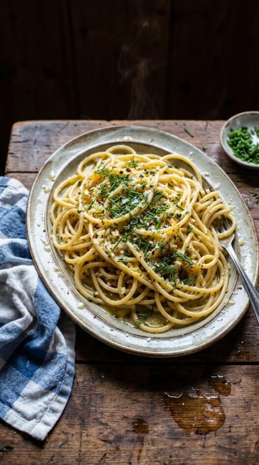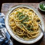 The compound butter is the foundation here, so make it well. Mash softened butter with garlic, fresh chives, dill, thyme, lemon zest, honey, and red pepper flakes until everything is evenly distributed. When you toss it with drained bucatini or spaghetti, the residual heat and some starchy pasta water create an emulsion that clings to the noodles. A generous handful of Parmesan melted in makes it even better. This is a great base recipe to riff on. Swap the herbs for whatever you have, add toasted walnuts or pine nuts for crunch, or finish with a handful of arugula. The compound butter can be made up to three days ahead and kept wrapped in the fridge.