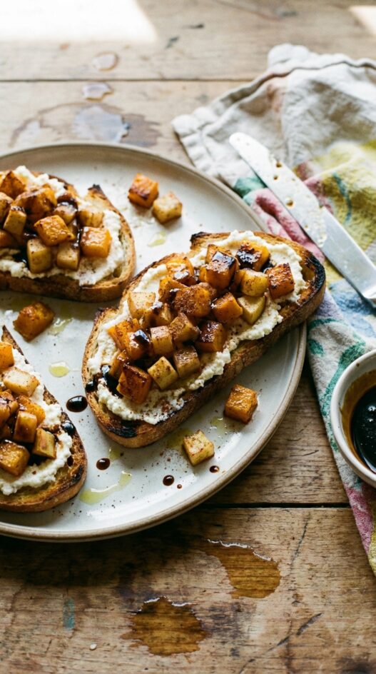 - Remove bread from the oven and top with ricotta cheese, then the roasted squash and apple mixture.