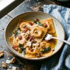 Homemade pasta filled with roasted butternut squash. Tossed in a brown butter sage sauce with pancetta and walnuts.