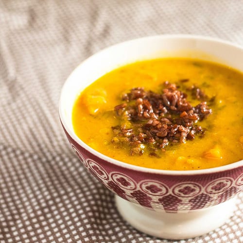 This soup is special. If I were having this at a restaurant, I’m sure it would go like this: a fancy presentation in which a wide shallow bowl is slid in front of me, with only a mound of rice artfully constructed in the center. The server would then take a miniature pitcher and pour the brightly colored soup all around, leaving me with an island of rice surrounded by a terra cotta sea. Print