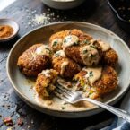 Tender rounds of creamy mashed potatoes are stuffed with cajun seasoned crab, sweet corn, smoky bacon, and sharp gruyere cheese that are deep fried to golden perfection and then drizzled or dipped in a creamy cajun lemon sauce with fragrant fresh basil.
